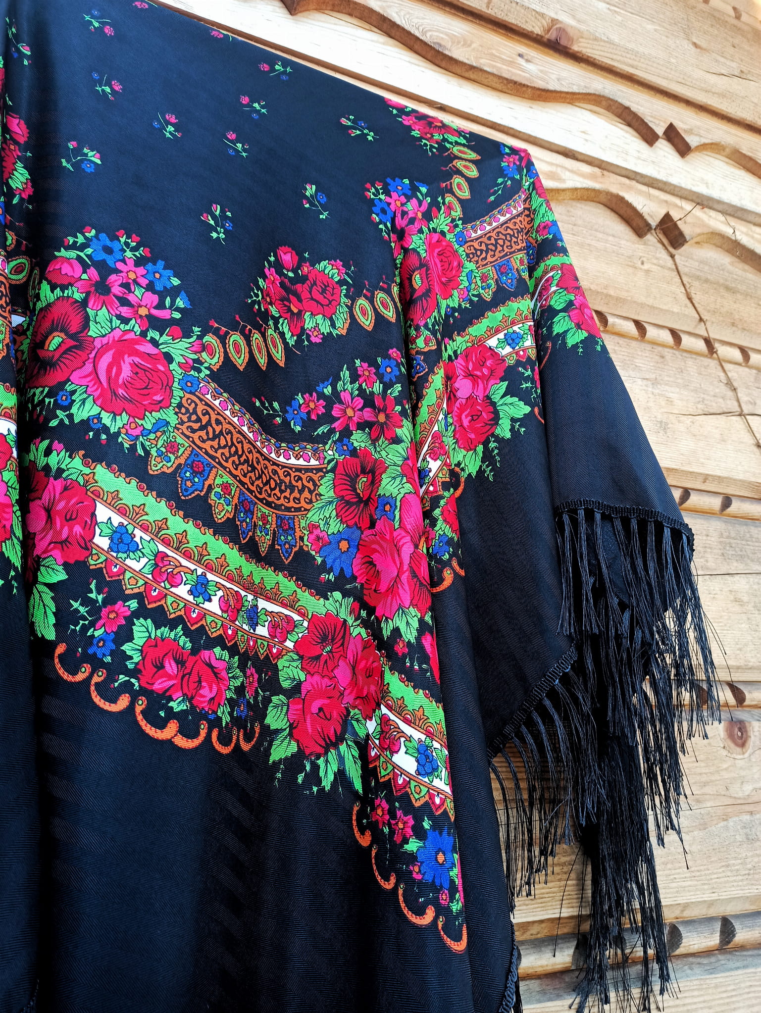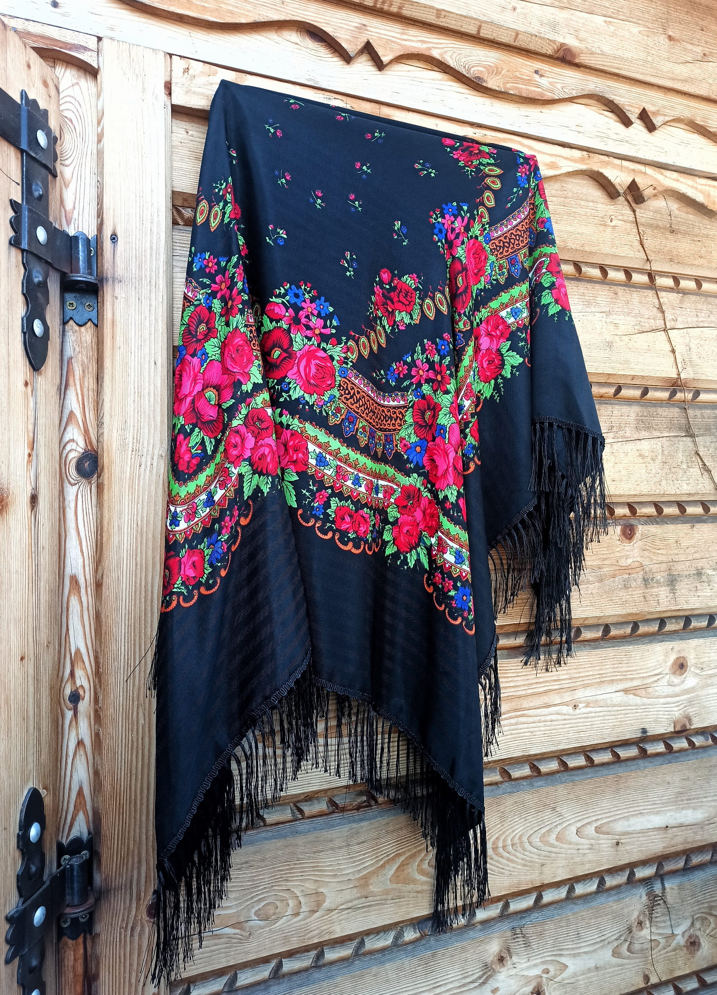 Góralska chusta z frędzlami - czarna w czerwone i niebieskie kwiaty