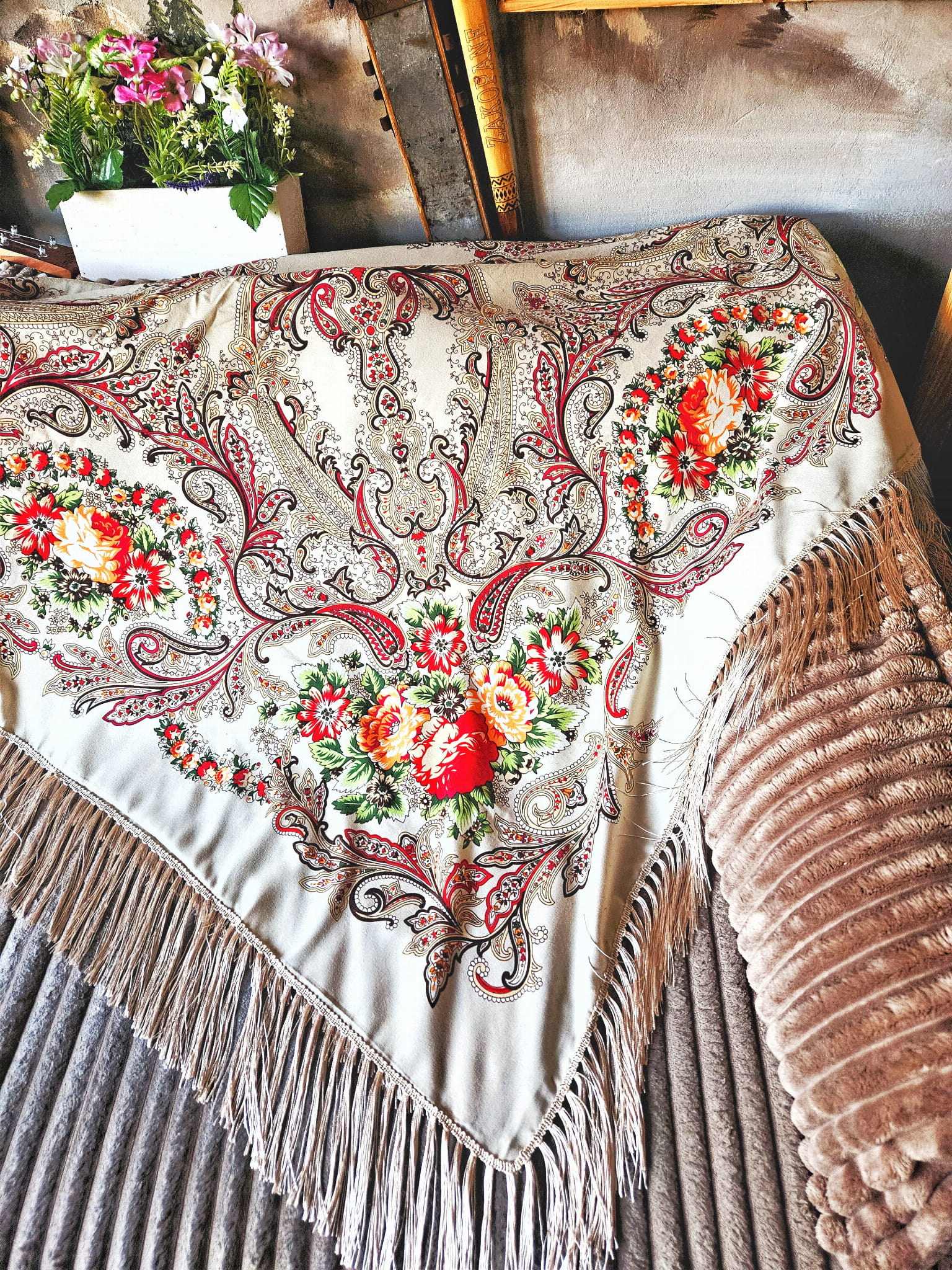 Góralska, kolorowa chusta z frędzlami, która urozmaici każdą stylizację.
