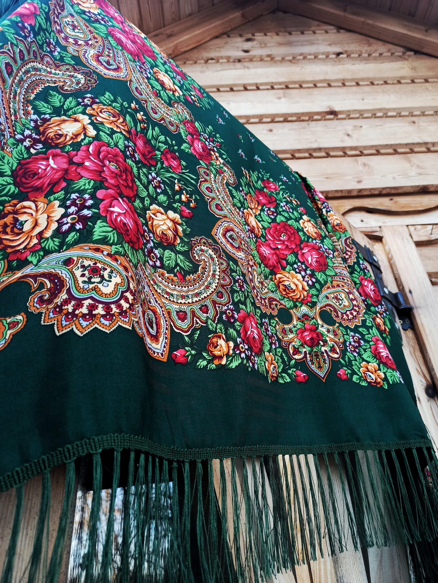 Góralska chusta z frędzlami - zielona w czerwone kwiaty