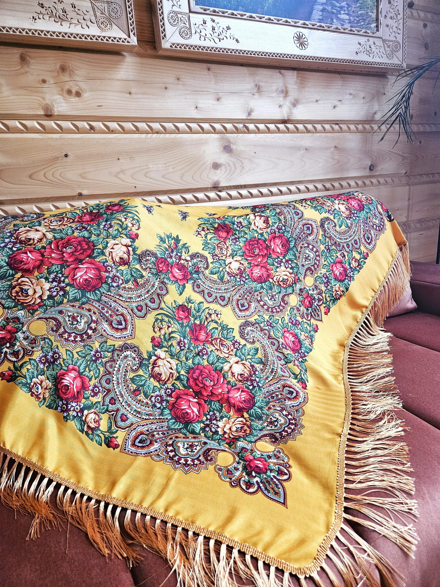 Góralska chusta z frędzlami - żółta w czerwone kwiaty