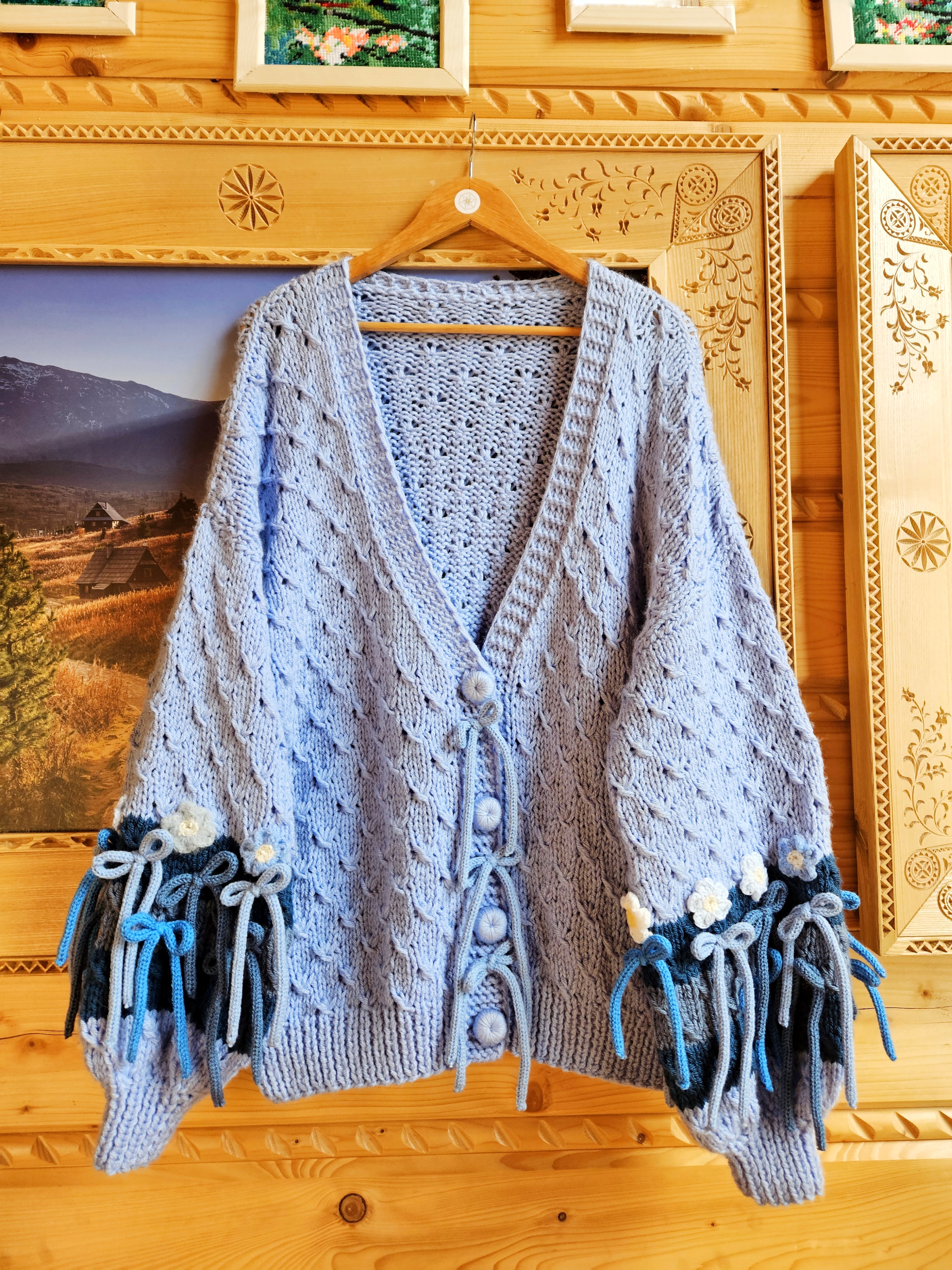 Skład materiału: w tym modelu podstawowa, szara włóczka to 80% wełna merynos i 20% akryl, wszelkie zdobienia na rękawach to włóczki wykorzystywane w produkcji naszych opasek, swetrów i torebek.