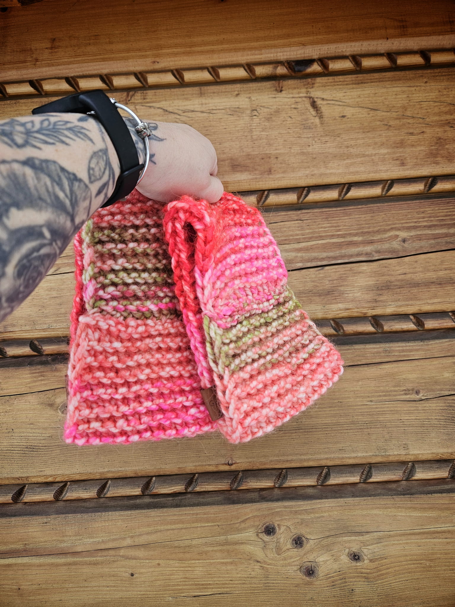 Wykonana jest w włóczki cieniowanej (czerwień, róż, morela i zieleń), przez co nie możemy wykonać dwóch jednakowych egzemplarzy, każda opaska jest unikatowa, ale zawsze możemy wykonać w danej gamie kolorystycznej.