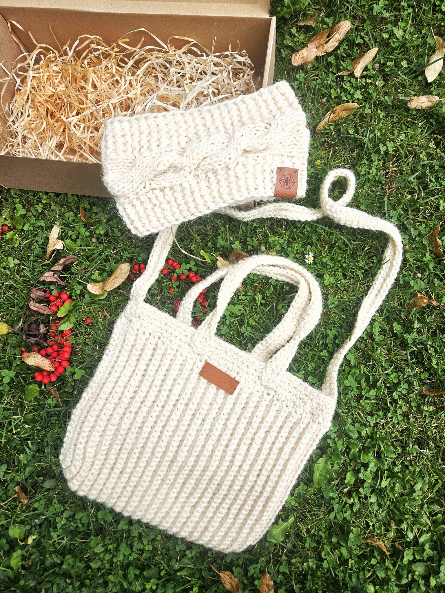W skład pudełka wchodzi wełniana torebka Ewa oraz opaska OWCA PODHALAŃSKA kremowa.