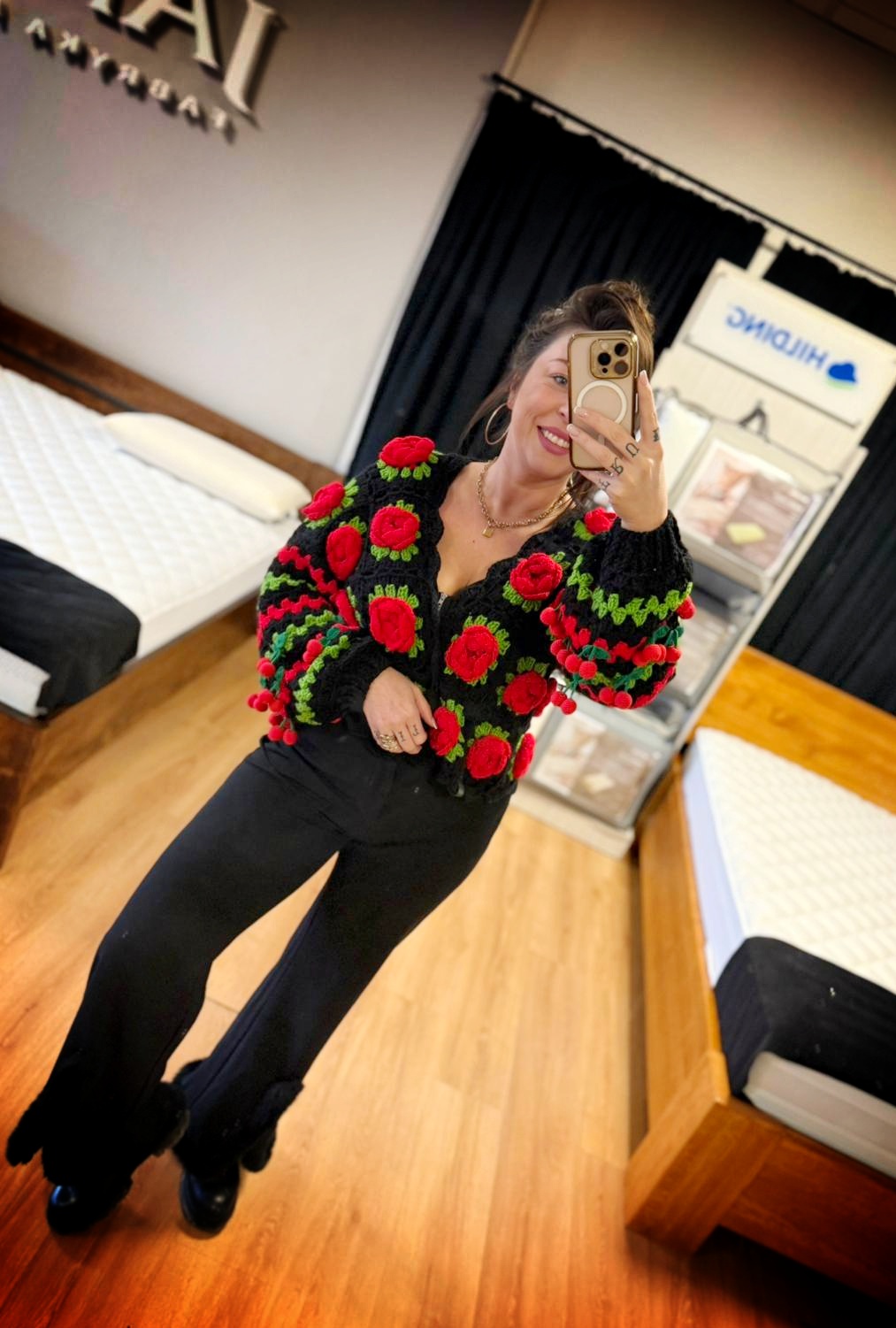 Sweter FIONA - Góraleczka (czarna w czerwone róże z wisienkami)